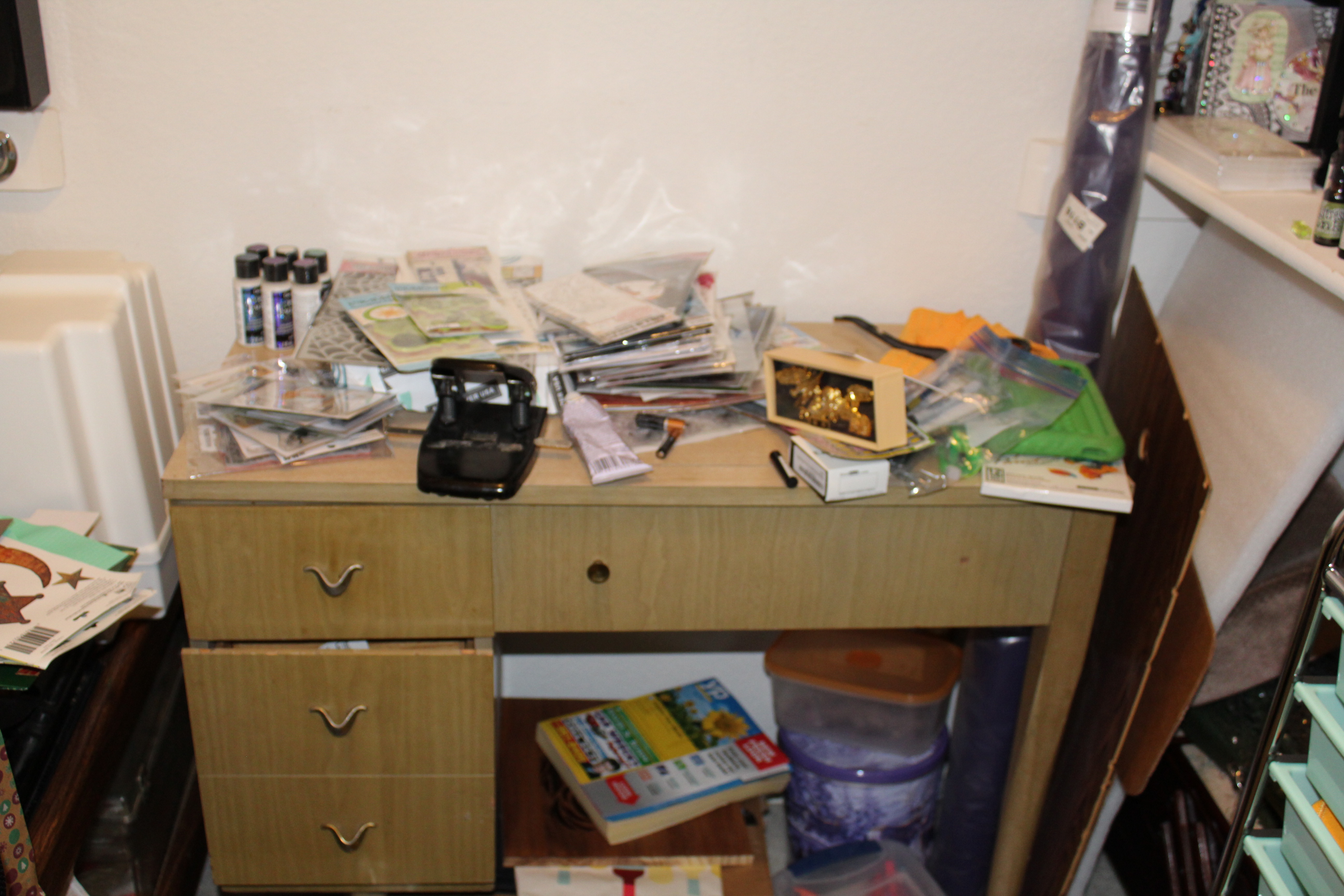 I am fortunate enough to have a well paying job and so does my husband. We are not rich by any means, but we are not struggling to pay the bills. So I can afford to buy any craft supply I want or need. I have my own craft room. Yes, it is a bit messy.