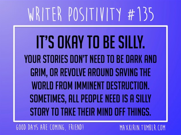 Your stories don’t need to be dark and grim, or revolve around saving the world from imminent destruction. Sometimes, all people need is a silly story to take their mind off things.
